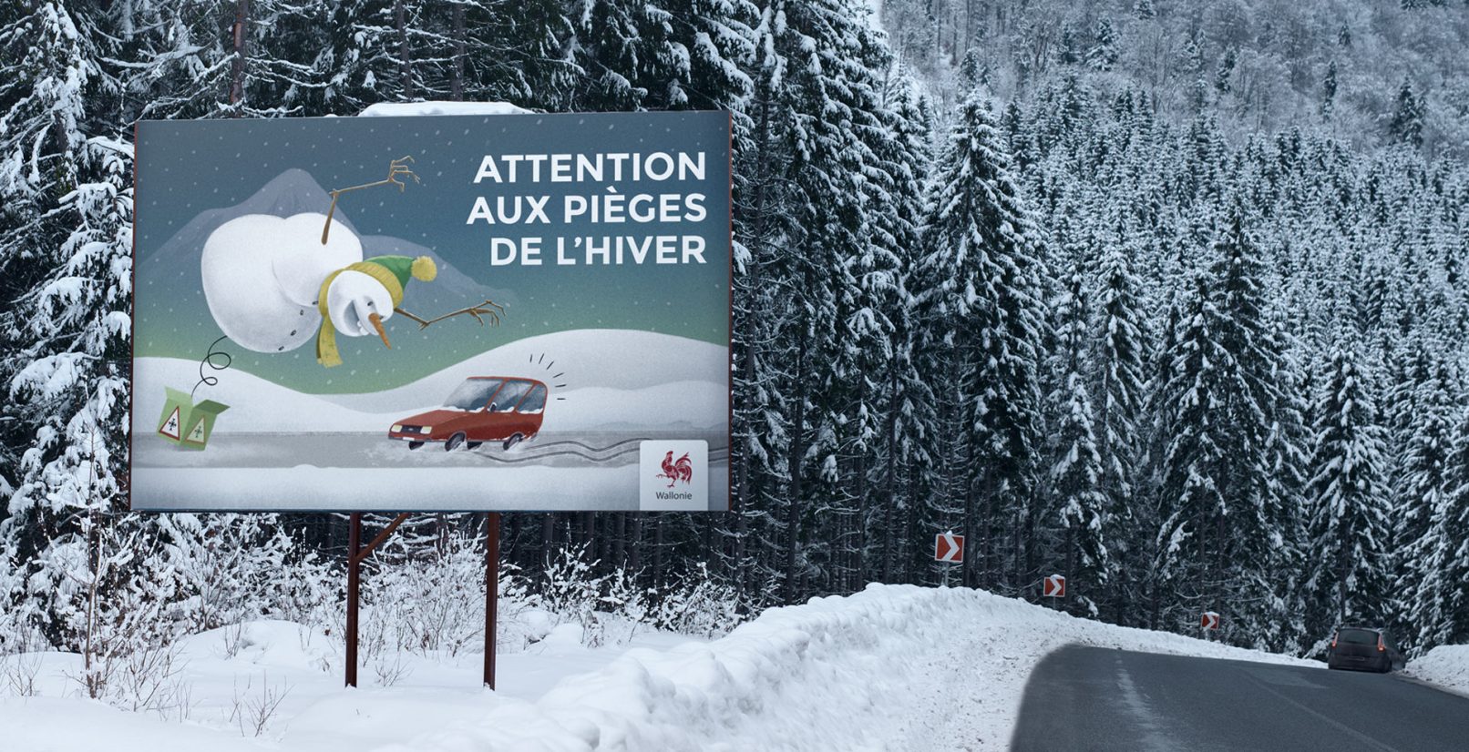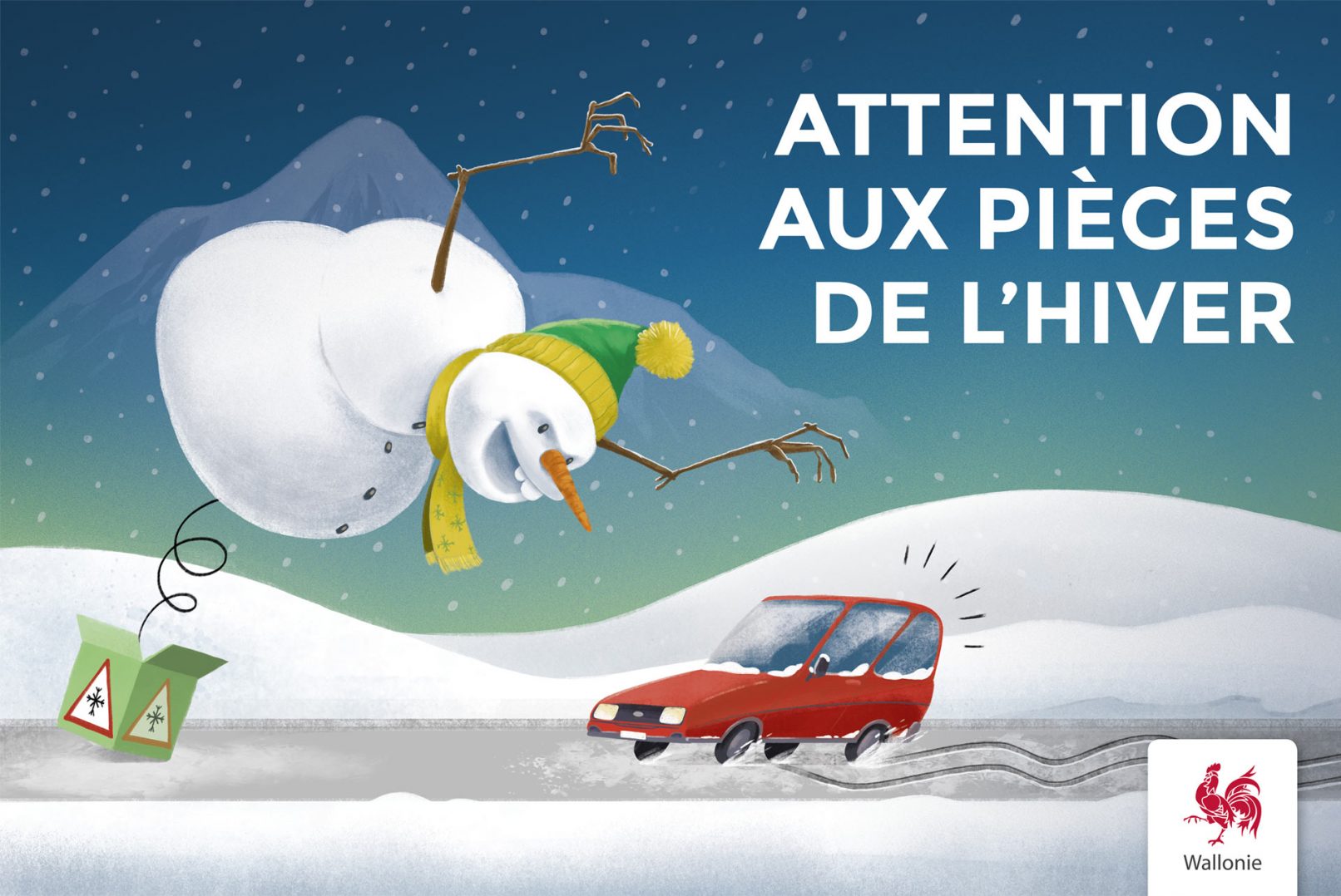 Illustration for the campaign “Attention aux pièges de l’hiver” to raise awareness about road safety during winter.
